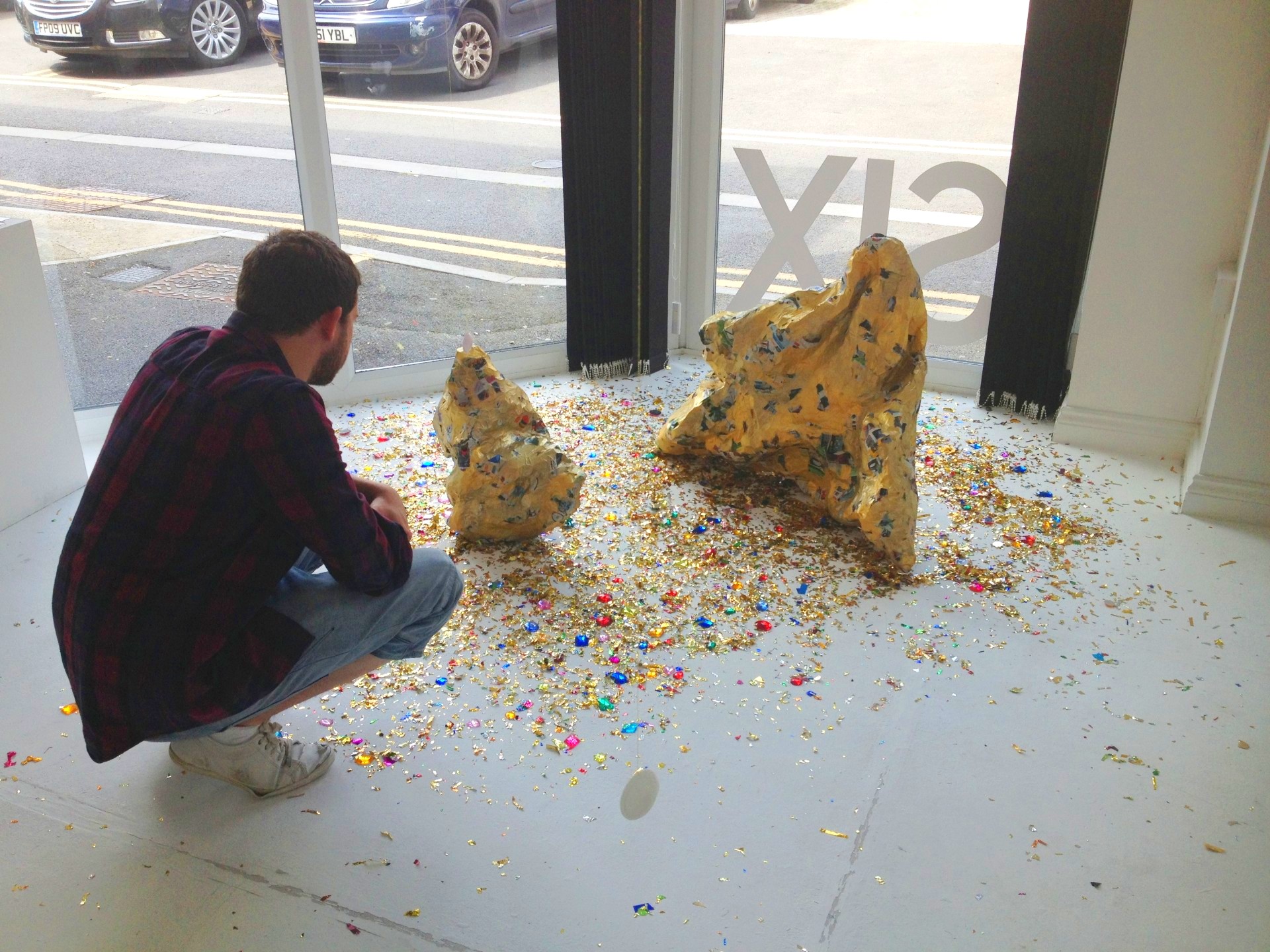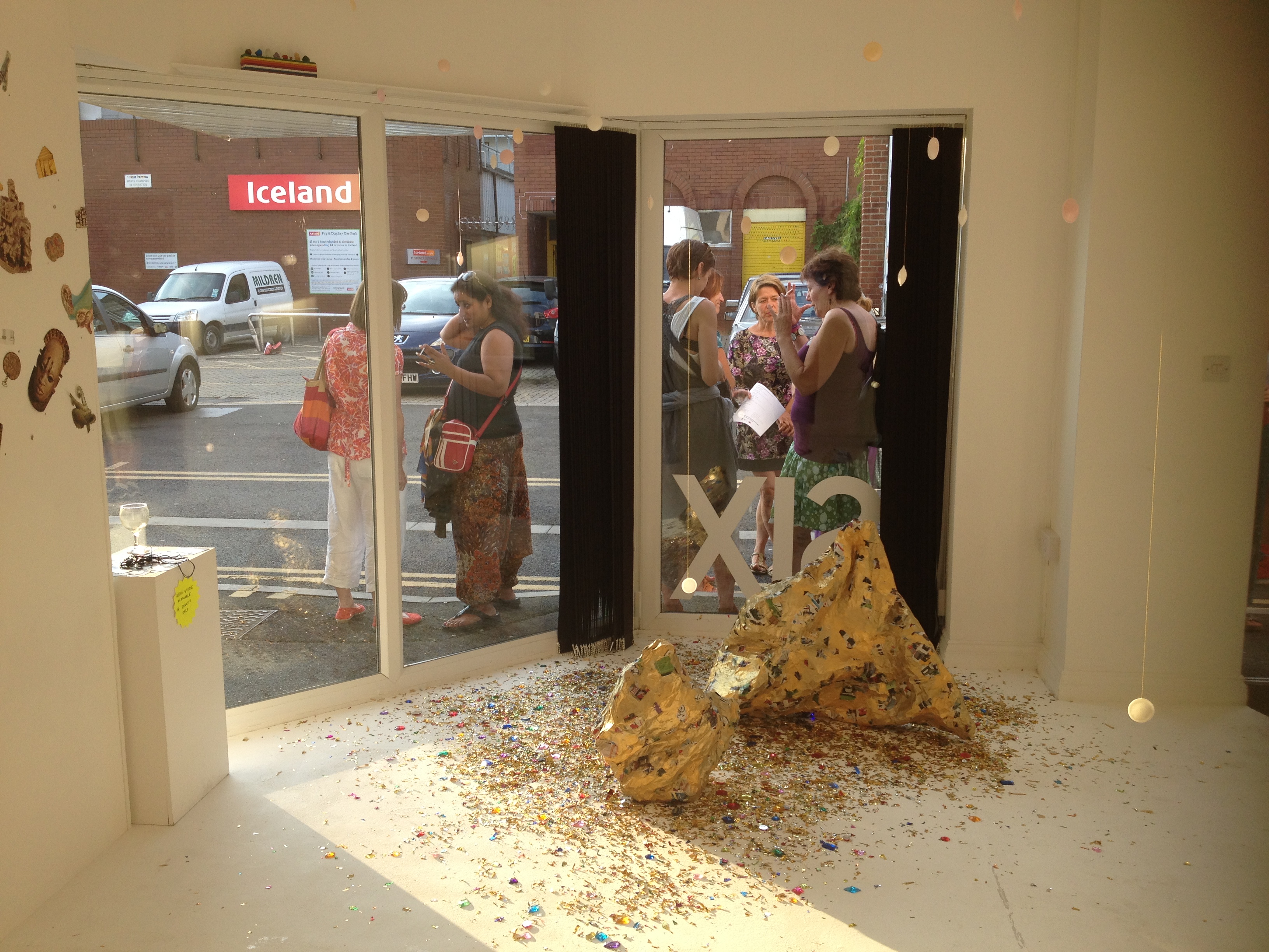 Chicken wire and Argos catalogue page papier-mâché, gold paint, questions and answers from Trivial Pursuit (Baby Boomer edition), fake gemstones, gold glitter and flying saucer sweets