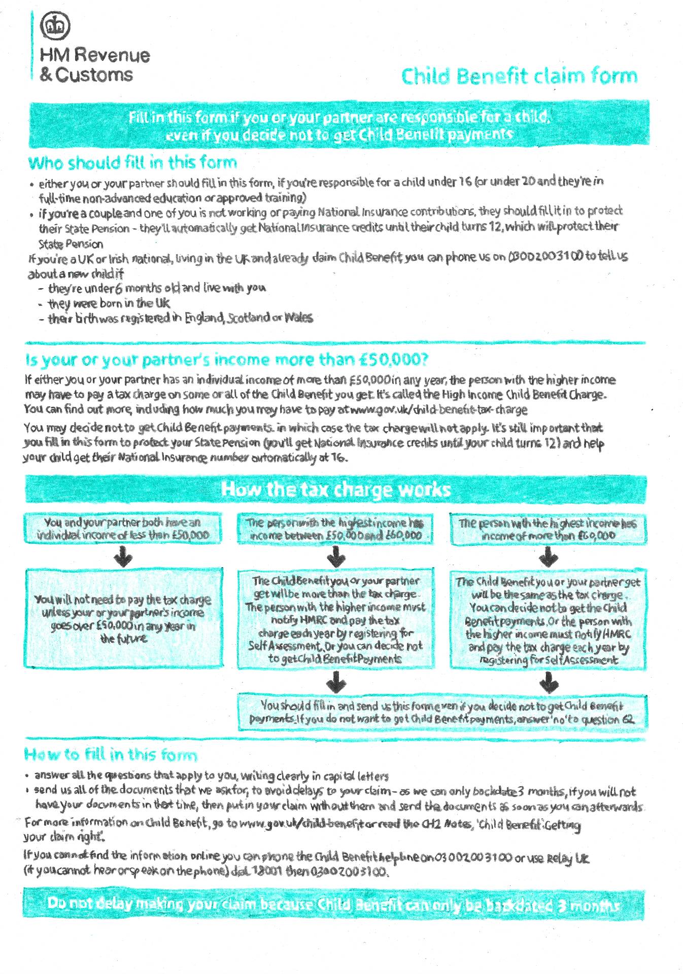 Children’s coloured pencil drawing of the 2023 HMRC Child benefit form. Framed dimensions 748 x 1003mm