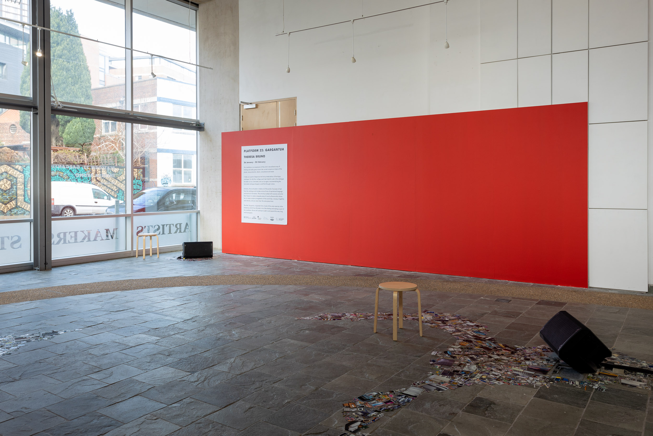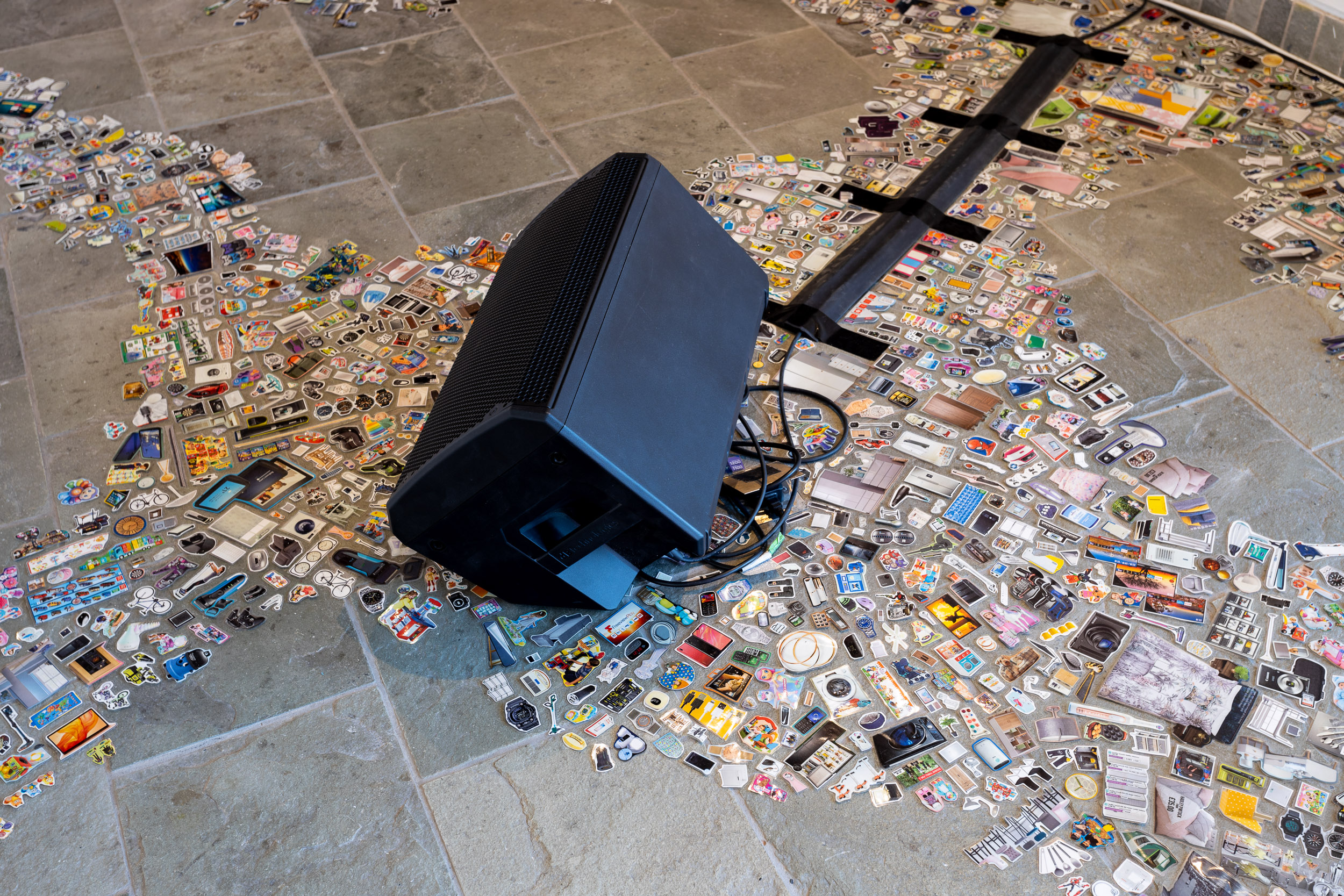 2023, Materials: Floor collage with an accompanying sound installation. The collage is made out of every item listed in the final printed edition of the Argos catalogue. Each item listed for sale in the catalogue has been cut out, laminated, and cut out again, monumentalising the laminated catalogue shoppers could flick through in-store. The sound piece is made out of thousands of excerpts of text from the catalogue and includes various forms of aspirational language and technical information. The artist has worked with musician and artist Rian Treanor to create a bespoke piece of sound software which allows her to make arrangements of the sound clips, varying in legibility and intensity.