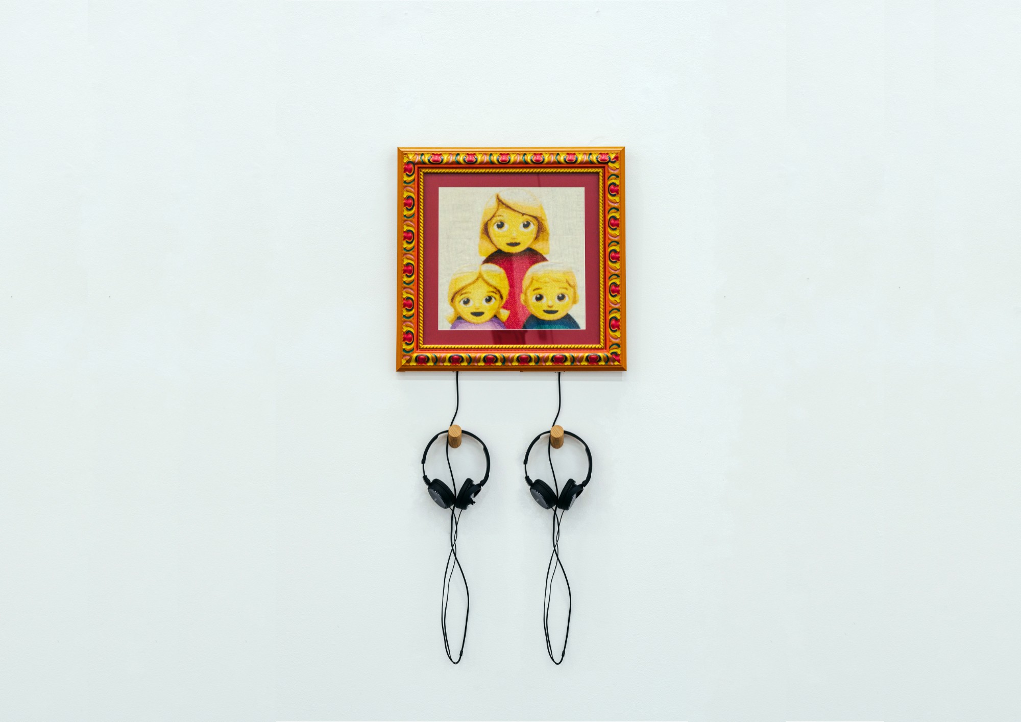 2025, Materials: A cross stitch of over 6,500 stitches that took 9 months to make, forming a lone parent emoji, paired with a sound piece. The script was written using words from the lone parent channel on mums.net and voiced by mothers themselves. The sung aspect of the piece lists a parent survival kit and is sung by a mum choir. Framed dimensions: 51.5cm x 53cm x 1.5cm