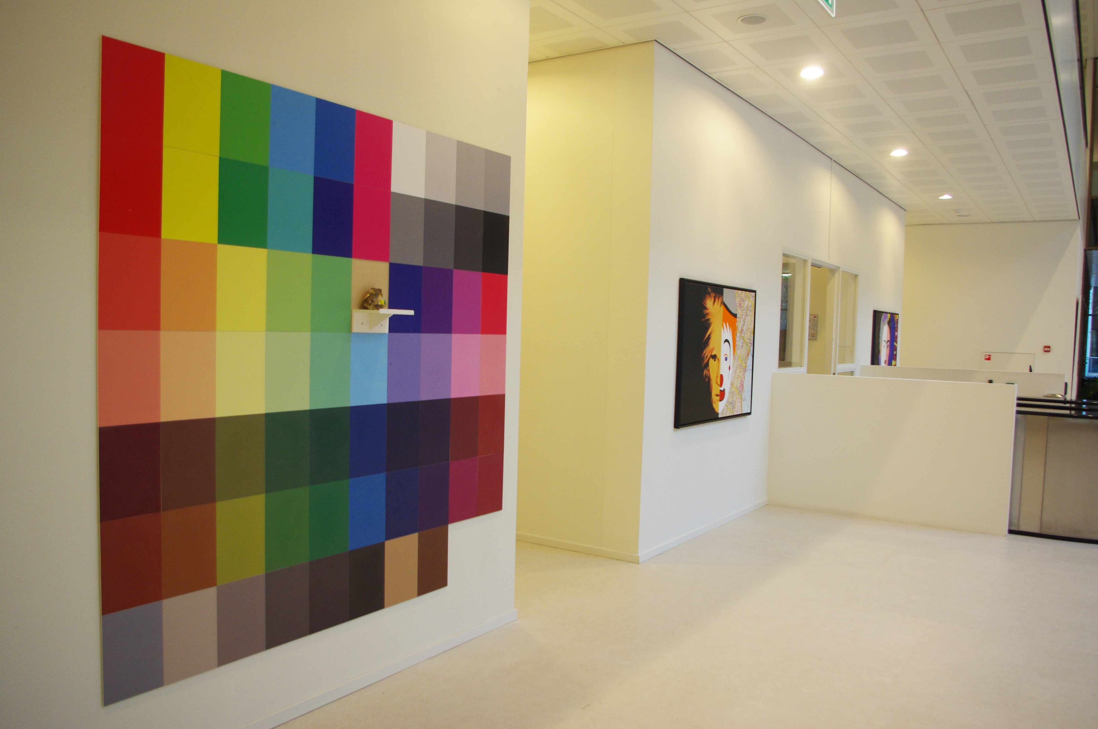 Photoshop colour chart printed onto individual acrylic sheets, 1 rock, shreds of dyed tissue paper